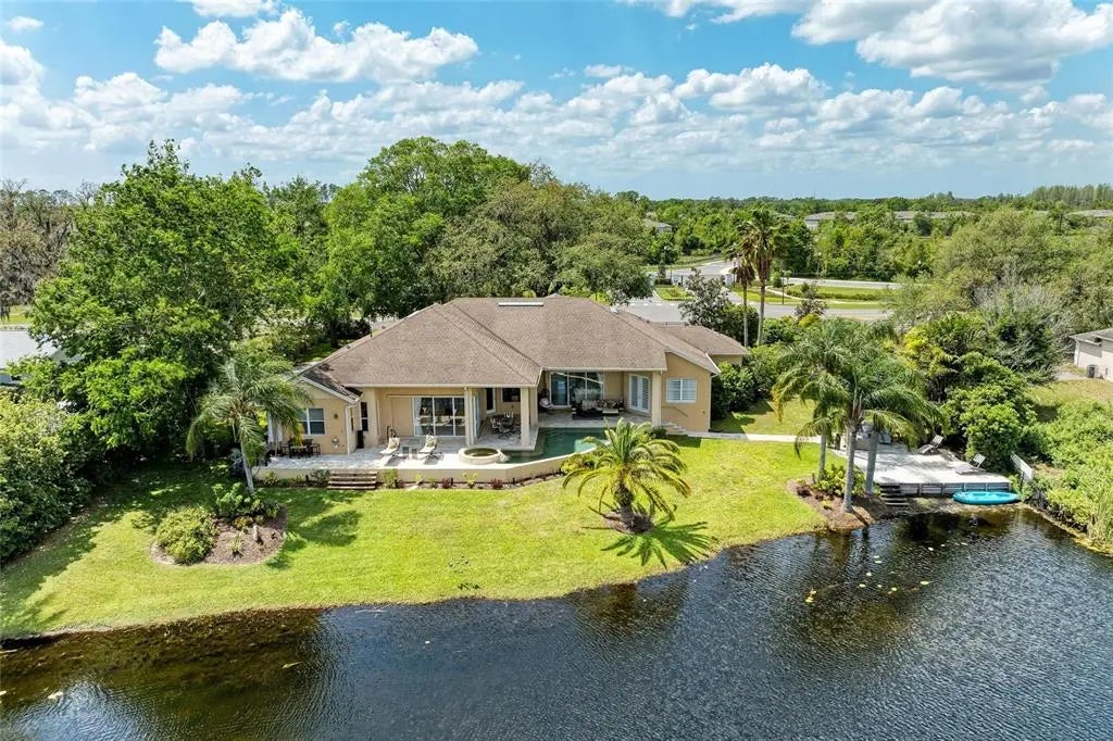 Nestled on a tranquil, spring-fed lake brimming with bass, turtles, and vibrant wildlife like blue herons and roseate spoonbills, this exquisite custom-built home spans over 1.2 acres with an impressive 164+ feet of pristine lake frontage. The 3,700 sq ft interior boasts a triple-split, open floorplan with soaring 16’ ceilings, elegant travertine flooring throughout, and panoramic lake views from nearly every room. The gourmet kitchen is a chef’s delight, featuring solid wood multilevel cabinets, gleaming Brazilian granite countertops, a Sub-Zero refrigerator and matching freezer, a large prep island, and a hand-blown Italian chandelier that adds a touch of sophistication. The luxurious master suite offers a cozy sitting area, direct French door access to the lanai, a spa-like bath with a deep jacuzzi tub, dual rain showers, and a private enclosed garden for serene mornings or romantic evenings. A second lakefront master suite, complete with its own entrance and bath, serves perfectly as an in-law or guest retreat. Three additional en-suite bedrooms, a dedicated office with lake views, a chandeliered powder room, and a spacious laundry room with AV/security wiring round out the interior.