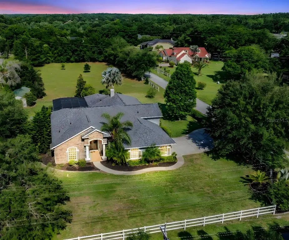 One or more photo(s) has been virtually staged. **Seller Motivated, bring reasonable offers** Welcome to your oasis nestled in the serene Keystone area of Odessa, FL. This Executive Home sits on a sprawling 1.6 Acres of lush greenery, offering privacy while still being conveniently located everything. Boasting an expansive 3,720 sq ft of living space, this property promises an enviable lifestyle of comfort, privacy & leisure. There is no shortage of space w/4 Bedrooms, 3 Baths, Office & Bonus Room. As you enter the great double doors, you're greeted by a spacious & inviting foyer w/ornate pillars, leading you into the heart of the home w/a view of the beautiful screen enclosed Pool. This split floorplan offers the utmost in privacy. The Large Living Room has sliding doors to the Pool Enclosure & is also open to the Dining Room & leads you to the massive Kitchen & Family Room. This open concept integrates the Family Room & Eat In Kitchen areas creating the perfect space for entertaining guests. The gourmet kitchen is a chef's delight, 42 inch cherry wood cabinets w/granite countertops, breakfast bar, stainless steel appliances, & ample cabinet space for all your culinary needs along w/a center island providing additional prep space. The cozy family room boasts a wood burning fireplace, w/ornate mantle, built in Shelving & trey Ceiling creating an inviting atmosphere for gatherings w/another amazing view of the Pool Enclosure. Large windows throughout the home flood the space w/natural light, illuminating the beautiful Luxury Vinyl Flooring & finishes. Retreat to the luxurious Primary Suite, where tranquility awaits. This large Suite also has a trey ceiling, walk in closet & sliding door out to the Pool for those late evening swims. This private sanctuary features a spa-like ensuite bathroom w/dual vanities, a soaking tub, & a separate walk-in shower. Three additional bedrooms & two bathrooms (Pool Bath) provide plenty of space for family & guests on the opposite side of the home. Plus, there is an enormous Bonus Room in the back of the home w/ transom windows, built-in shelving & plenty of space to make an In-Law Suite out of…other neighbors have done this or just perfect for additional space for the family & their hobbies w/access to the Pool Enclosure. Step outside to your own private paradise, where a screened-in pool & paver patio await. Whether you're lounging poolside w/a refreshing drink or hosting a BBQ w/friends, this outdoor oasis is will impress. The patio is plumbed already for an outdoor kitchen w/an amazing view of the Pool & Backyard. This enormous 1.6 Acre Lot has so much to offer along w/a large 19x8 Storage Shed used to store the lawn mower & equipment. You are allowed to have Horses for the Equestrian Enthusiast. Plus, you will love the picket fence that borders the entire lot creating a fun & safe haven for your pets & family events. Back into the home, the Utility Room has a utility sink & WD off the side entry 3-car garage w/ample storage space for recreational toys. Roof 2019; 2 AC Units 2016. NO CDD & Very Low HOA with little restrictions. Located in Odessa’s Keystone Community, this home offers an escape from the hustle & bustle while still being conveniently close to the Trail, Library, Park, Shops & Airport. From its impeccable schools to its unbeatable location & community feel, you are guaranteed to live your dream lifestyle. Come Make it Your Own! OWNER OCCUPIED!!!!!