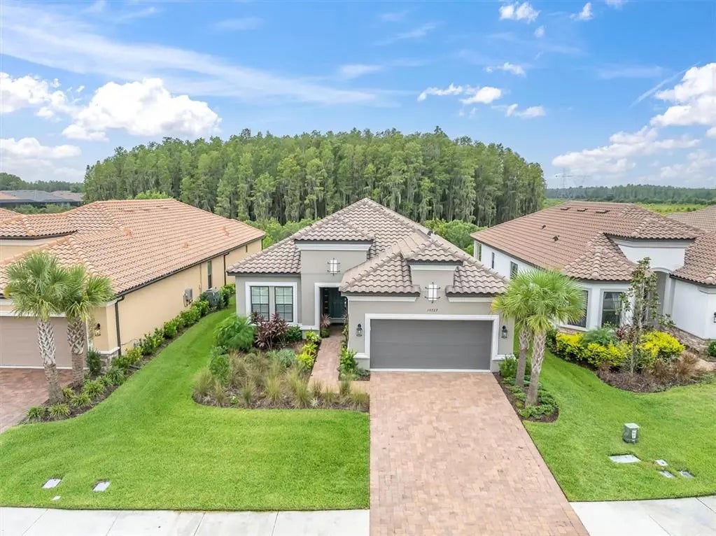 EXQUISITLY DESIGNED TAYLOR MORRISON LAZIO ON A PREMIUM CONSERVATION LOT. NO FLOOD ZONE! Welcome to your Taylor Morrison Lazio spanning 2400 sqft on one story offering 3brs, 3 ba + office w/ 3 car tandem garage, on a private conservation lot w/ view of tranquil Cypress trees in the gated enclave of Esplanade at Starkey Ranch. Boosting $250K in builder upgrades & 20K invested after, this well-appointed home offers noteworthy upgrades including 8-ft doors, 10' ceilings, lavish Engineered Hardwood in main living areas + office & Primary br, tray ceilings, crown molding, motion light switches, Elfa System closet built-ins, Plantation shutters & tandem garage. The curb appeal is enhanced by the Mediterranean exterior elevation, barrel tile roof, lush landscaping including solar landscape lighting & paver driveway + walkway. Stylish front door w/ sidelights greets guests. As you enter the foyer w/ tray ceilings and chandelier, to the right is Br 2 w/ plush upgraded carpet & padding, ensuite bath & walk in closet + built-ins. To the left is Br 3 w/ an adjacent full bath & linen storage closet. A dedicated office w/ seamless pocket doors provides a sizable space for a plethora of uses. As you enter the main living area, the open floor plan unfolds revealing a consistent flow of hardwoods and neural Sherwin Williams Veil of Dusk & Revere Pewter that blends the space effortlessly. The living room is highlighted by can lights, ceiling fan, tray with Crown, and sliders that blanket the space in natural light & provide a view of the Cypress trees. A formal dining area with ample space for a 6-person table is anchored by a chandelier. The elegantly designed GOURMET kitchen will impress w/ an abundance of 42’ solid wood White Cabinets + drawers featuring soft close + pull-outs, Crown Molding, upgraded extended cabinets complimented by Statin Nickel hardware, grey subway Backsplash and a showstopping elegant Matte Quartz Counters all illuminated by multiple can lights. Stainless GE Café Advantage appliances will impress including Dishwasher, Built in GE Café Convection Oven & Microwave, Gas cooktop & Designer Hood. Apron sink overlooks a window. Pantry with customizable Elfa built-ins helps you stay organized. Massive Island will be a place to gather & entertain including ample storage w/ front knee wall cabinets and seating for 4 bar stools accented by pendant lights. Extra space adjacent to kitchen allows for a café dining table. Primary Bedroom is highlighted by 3 lg windows that frame the trees complimented by shutters, hardwood floors, decorative tray ceiling w/ fan and walk in closet. Spa-like Master Ensuite includes fine details like his & hers sink w/ quartz, cabinet & drawers, plus an oversized walk-in shower w/ glass enclosure, + a spacious walk-in closet offering Elfa organization. Enjoy a peaceful, private view of the conservation from the covered lanai. Relax & unwind w/ nature while viewing native birds & butterflies. Enjoy the unparalleled maintenance-free luxury lifestyle at Esplanade featuring superior amenities such as 24hr Security gate, Clubhouse, fitness center, Resort Style & Resistance Pool, Tennis Courts, Pickleball Courts, dog Park, firepit, Playground & ongoing social activities. Lawn & weed care included. Residents can also enjoy Starkey Ranch amenities. Zoned for Magnet Starkey K8. Close to Restaurants, shopping, Golf Courses, Beaches & Tampa Airport. This turnkey, elegantly appointed home will not last! Make your move today!