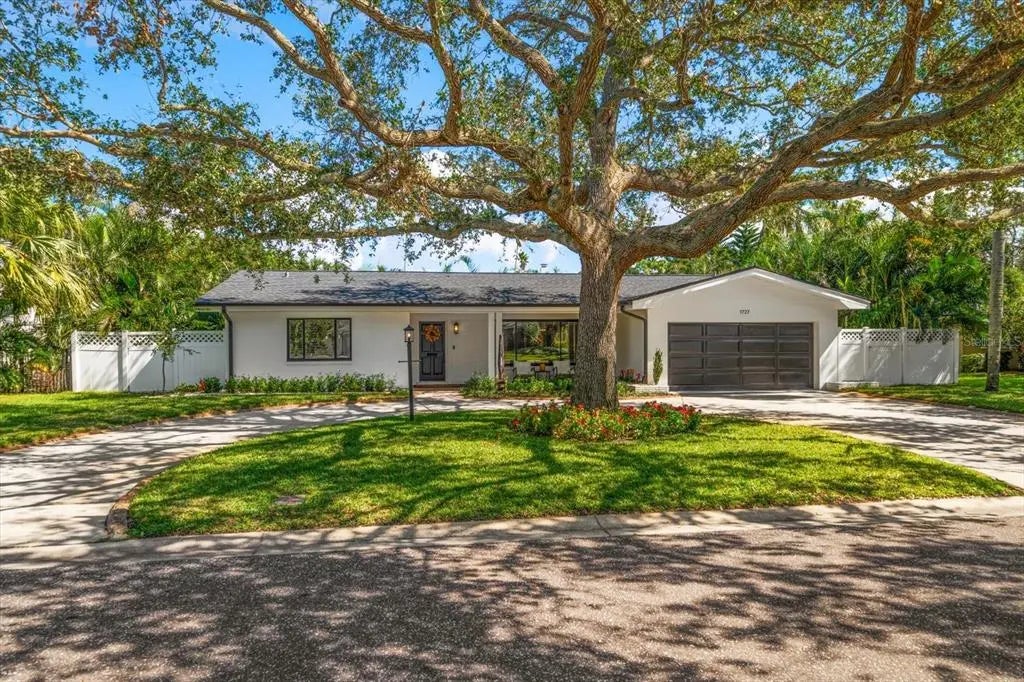 Nestled on one of the most coveted streets in the heart of Belleair, this charming and captivating 3 bedroom, 2 bath, 2 car garage home shows like a model, and has been meticulously remodeled with amazing quality and perfectly maintained. Upon entering the circular drive, the lush landscaping and gorgeous shade tree will impress, and the curb appeal of this home will draw you in. The beautifully landscaped front yard leads you to a welcoming front porch, perfect for enjoying morning coffee. Step through the front door into the spacious foyer, where your eyes are immediately drawn to the light filled, open concept living area. Fine features include new wood plank porcelain tile, 6” baseboards, recessed LED lighting, and plantation shutters throughout the home. The living room, dining room and kitchen flow seamlessly together, creating a perfect space for entertaining and family gatherings. A huge picture window in the living room bathes the space in natural light, highlighting the fresh, modern design and new finishes throughout. The living room offers ample space for comfortable seating, the dining area, situated between the living room and kitchen can easily accommodate a large dining table. The kitchen is a delight, with stainless steel LG appliances (2020), 42” solid wood custom cabinetry with soft close features, a large closet pantry, workspace sink with a touch faucet, spacious one level stone countertops and breakfast bar for seating. The living spaces flow to a serene sunroom, surrounded by windows overlooking the incredibly private, lush, fenced backyard.