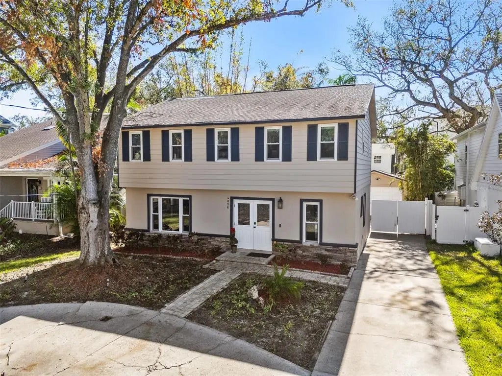 This Sunset Park home presents a unique opportunity to create the space of your dreams! While the four-bedroom, 2.5-bath home experienced some flood damage on the first level, it is now ready for your personal touch. Solid block construction, impact-resistant French doors, and hurricane-impact windows with plantation shutters offer durability and style. A luxurious travertine walkway guides you to a stunning Pebble Tech pool, spa and spacious travertine deck, ideal for hosting gatherings. Inside, you'll find a spacious layout with a large, light-filled living room, and generous kitchen-family room combo. Travertine and wood-like ceramic tile flow throughout the downstairs, while hardwood floors grace the upstairs. This home offers the advantage of second-level bedrooms, providing privacy and being unaffected by the storms. The expansive primary suite boasts a remodeled en suite with a luxurious glass walk-in travertine shower and riverstone tile floor. The fully fenced backyard is ideal for entertaining, complete with landscape lighting. A circular driveway with a gated entry to the detached garage adds to the home's curb appeal. Strategically positioned in South Tampa, this property offers proximity to A-rated schools, diverse dining, upscale shopping, entertainment venues, International Plaza, Raymond James Stadium, Interstate 275, Tampa International Airport, downtown Tampa and the scenic bay bridges leading to the beaches. Seize the opportunity to create your ideal home or investment in sought-after South Tampa.