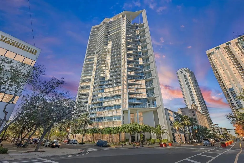 Welcome to this stunning, contemporary 1-bedroom condo with a versatile den, ideally situated in the heart of downtown St. Petersburg. Boasting an open floor plan with floor-to-ceiling windows dressed in electric shades, this home is bathed in natural light and showcases sleek hardwood and porcelain tile flooring throughout.
