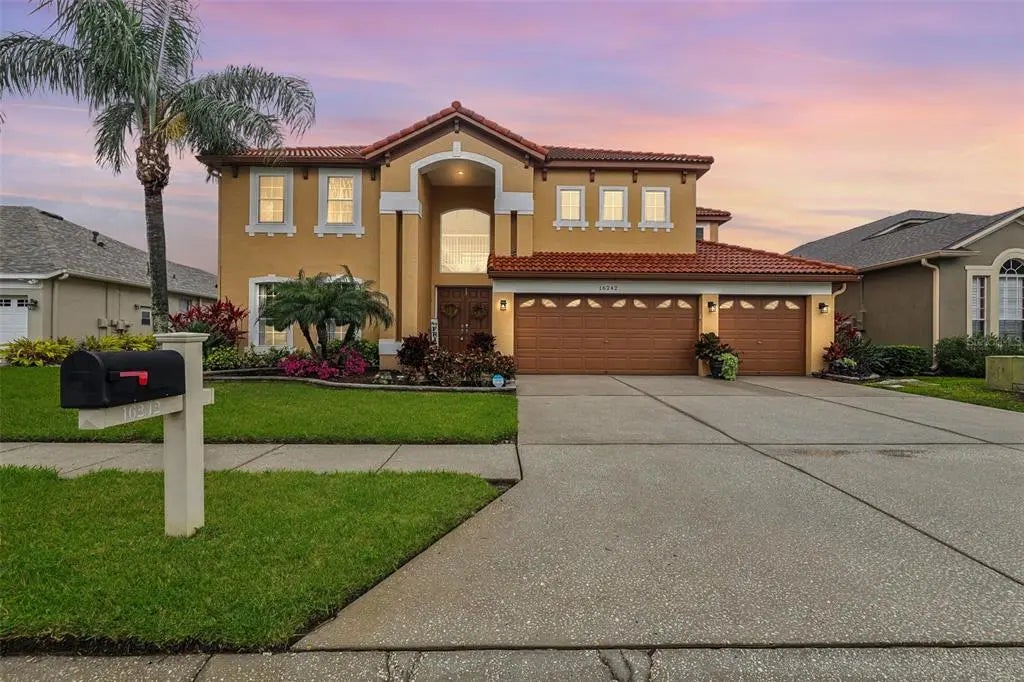 Welcome to 16242 Rambling Rd., a stunning 5 bedroom, 4 bathroom home with a spacious media room, located on a quiet dead-end street in the sought-after gated community of Ivy Lakes in Odessa. This beautifully maintained home features a guest bedroom and full bath on the main floor with direct access to the screened-in patio, pool, and spa, perfect for guests or multigenerational living. The main level boasts gorgeous wood-look tile, a flexible sitting/dining area, an upgraded kitchen with granite counters, breakfast nook, and under- and in-cabinet lighting, all opening to a large living room with sliding glass doors to a serene lake-view backyard. Upstairs includes four bedrooms, one with a private en suite, plus a spacious primary suite designed for comfort and style, featuring a generous layout, a beautifully updated bathroom with dual vanities, a soaking tub, separate walk-in shower, and his and hers walk-in closets. The versatile media room includes a 10’ projector screen and short throw 4K projector (both convey). Upgrades include professional paint throughout, new carpet (2020), new pool tile (2024), all-new interior and exterior light fixtures/fans, relocated A/C units, hot water re-circulator, whole-home water treatment system with reverse osmosis, and hurricane-rated windows installed in 2023 (upstairs front bedroom, primary bath, and upstairs bathrooms). The exterior is equally impressive with a Spanish tile roof, lush green space, fenced backyard, 3 car garage, and access to Ivy Lakes’ park, basketball, sand volleyball, soccer field, and playground. This is Florida living at its best, luxury, space, and scenic views in a family friendly community!