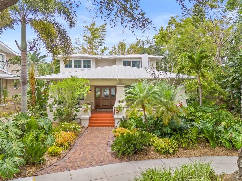 Just one block from Tampa’s iconic Bayshore Boulevard and nestled on a quiet street in Historic Hyde Park, this 1917 bungalow sits on a unique 9,750 SF lot in Flood Zone X. A welcoming 350+ SF covered veranda leads into the 3-bedroom, 2.5-bathroom main residence, reimagined by NYC design firm Bromley Caldari. The home features impact-resistant JELD-WEN windows, smooth stucco and lap siding, newly-refinished mahogany exterior doors, and solid composite interior doors. Inside, rich ebony cork and refinished hardwood flooring flow through sunlit, open spaces, including a chef’s kitchen with custom cabinetry, Wolf appliances, and a rolling island. The downstairs primary suite includes a walk-in closet and spa-like bathroom with double sinks, smart toilet, heated floors, and a capiz shell shower. Upstairs are two sunny bedrooms, a second full bathroom with soaking tub, and a generous walk-in closet room. Double mahogany doors open from the kitchen to a nationally certified Xeriscape yard with three bluestone patios, a Brazilian Ipe deck and dining pergola, native landscaping, a fish pond, and fruit trees. The detached, air-conditioned 2-car garage includes an air-conditioned guest apartment with kitchenette, full bathroom, and private entry. With a metal roof, Generac™ whole-house generator, two Rinnai™ tankless water heaters, and a transferrable termite-free warranty, this Hyde Park gem delivers quality, character, and timeless appeal. Come experience where design meets peace of mind. Your bungalow dream starts on Richardson Place.