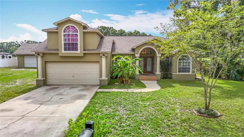 Car Enthusiast's Delight! This Contemporary 4 Bedroom 3 Bath Home was built in 2003 has an attached 2 Car Garage and Additional 2 Bay -3car 1120 sf Detached Garage with attic and a 9000lb lift, if you need a place to work on your cars, hobbies & park your boat, RV, and other Toys this property is for you! No Deed restrictions and approx 1/2 Acre to enjoy country living near city conveniences. As you enter through the double Glass front doors of this Gem, you'll notice the high ceilings and Open Floorplan is full of possibilities. Newer modern style LVP flooring in all of the main living areas offers a great palate towards making this your own. The Oversized Great room flows into the Formal Dining area & kitchen with ample cabinets & island w Breakfast Bar, Cute Breakfast nook overlooks the Massive 33 X 23 Covered & Screened Lanai. This home has 3 bedrooms 2 baths downstairs and upstairs the 4th bedroom w Ensuite bath could easily serve as in In-law Suite, Teen Retreat, Media Room or Man/Woman Cave- such a versatile Floorplan! Primary Suite is on the First Level and features Double Walk-In closets, Large Primary Bath w Oversized 5 X 6 Shower w shower seat and Dual Shower Heads at 7 ft & 6ft respectively, perfect at any size. The Jacuzzi Style Jetted Soaking Tub offers luxury at the end of the day! Other great features are rounded corners, wired for surround sound throughout, tubes-in-wall pest defense, Culligan Water Softener & plenty of storage space both in the house and detached garage. Laundry room is huge and has under stair storage as well! One unique feature is that home is plumbed for Central Vac (was never installed) Recent UPDATES include. Roof NEW 2021, Septic redone approx 5 years ago, BRAND NEW Water Heater! Comes with Buyers Choice of Home Warranty up to 600.00 and Termite extended Warranty! All of this on 1/2 Acre Lot, No Flood zone, A rated schools minutes to the Suncoast Expway, Dining, Shopping and more! Just Bring your Toys and Imagination. Call Today!