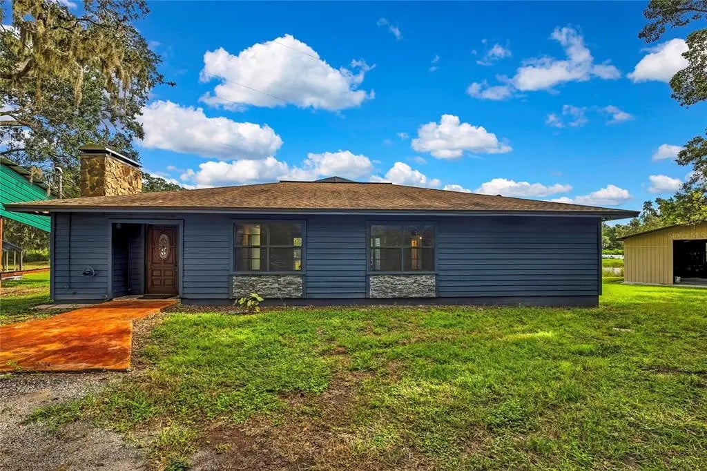 Set against a backdrop of 2.5 acres with a pond view, this Crenshaw Acres home offers 3 bedrooms, 2 baths, and 1,617 square feet of comfortable living space with versatile outdoor amenities. Extensive updates bring peace of mind including Exterior paint 2025! NEW Roof and A/C 2020! Water Heater and Water Softener 2020! Updated Plumbing 2020! Remodeled baths 2020! Zoned for STEINBRENNER School District. The welcoming entry features a Ring doorbell and front door with a glass insert. Inside, the family room showcases engineered hardwood floors and a modern stacked-stone wood-burning fireplace flanked by sidelights, along with a closet and two sets of double sliding glass doors leading to the lanai.