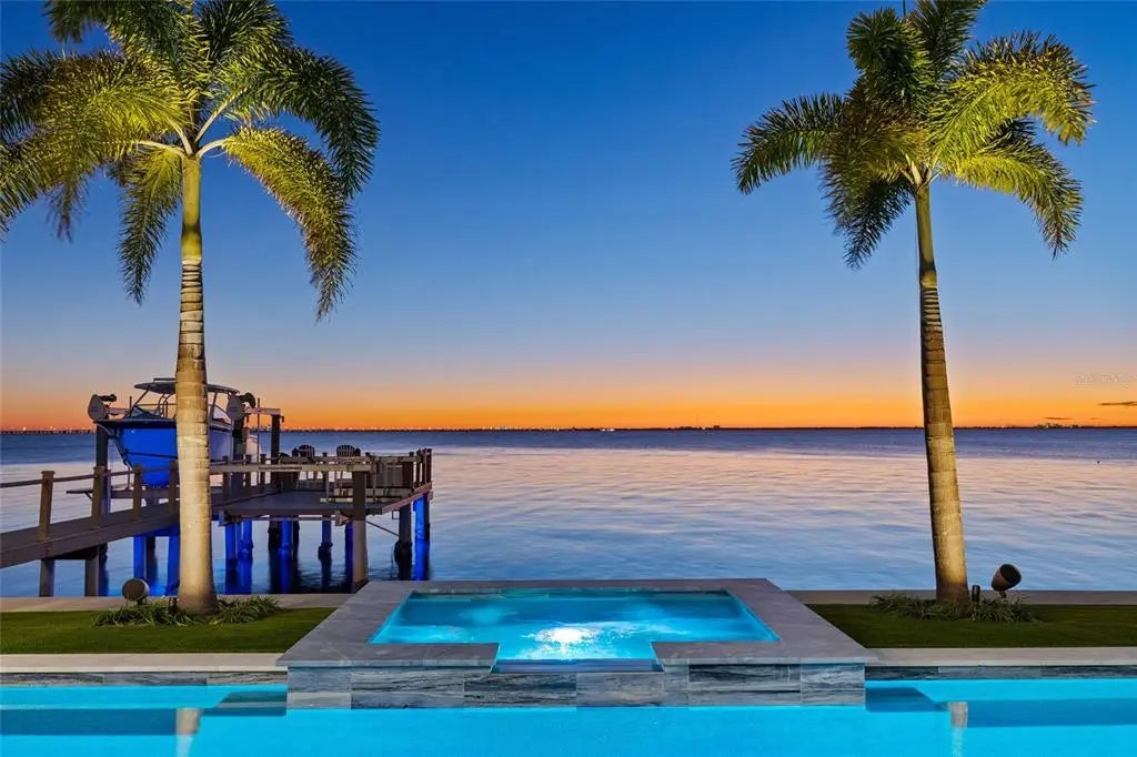 Experience breathtaking sunsets year-round with this open-bay waterfront masterpiece, a rare find built by top custom builder Windstar Homes. Showcasing unparalleled craftsmanship, stunning views, & extraordinary upgrades, this home offers a truly unique living experience. With 110 feet of water frontage, it was originally built in 2012 and thoughtfully updated in 2021, incorporating custom design finishes both inside & out, enhancing the home's beauty and functionality. This meticulously maintained, gated estate home was built with all block construction, hurricane impact windows, elevated breakaway wall system, a new whole-house gas generator, & 2 brand new & 1 newer HVAC systems. As you enter the home, the view of the open bay through the 10-foot-high sliding glass doors is breathless. The open floorplan & tall ceilings allow natural light to flood the space, highlighting the handscraped walnut wood floors & elaborate millwork that add rich, timeless character. Modern lighting, custom window treatments, & a Sonos-operated sound system elevate the home’s luxurious feel. The dining room features a custom-designed wine cellar, crafted from redwood & dark walnut to hold 800 bottles. The great room features a double-sided gas fireplace shared with the dining room & a circular built-in seating area with stunning bay views. This modern kitchen features top-of-the-line Subzero & Wolf appliances, including a double oven, 48” refrigerator, 24” refrigerator drawers, gas stovetop, dual dishwashers, & two workstation sinks. It's the perfect blend of style, functionality, & luxury. The custom walnut & maple cabinetry, paired with sleek Quartz & Porcelain countertops, is accompanied with two expansive islands & a large walk-in pantry. The covered lanai off the kitchen is designed for outdoor entertaining, featuring a fully equipped outdoor kitchen with a gas grill, sink, mini-nugget ice machine, & ample counter space. The covered lanai off the family room is fitted with a motorized shade. A full-size gym featuring professional equipment, a powder bath, an office, along with a bedroom & full pool bath complete the 1st floor. The 2nd floor is composed of the primary suite, 2 bedrooms with en-suite bath, entertainment space, & large laundry room. The primary suite features his & her custom closets. The primary bathroom blends natural stone floors & countertops with large-format porcelain walls with a jetted tub, a separate make-up counter, & a private water closet. Just outside the primary bedroom, a private covered lanai offers stunning views of the Bay. The other bedrooms have views of the Bay & access to a shared covered terrace. The top floor offers versatile space with a powder bath, built-in cabinetry, & an undercounter refrigerator/freezer with breathtaking views of the water from its private lanai. The backyard outdoor space is a true oasis, featuring elegant marble pool decking, multiple gathering areas, a concrete gas firepit & a designer saltwater pool & spa. The area is beautifully complemented by artificial turf with integrated outdoor lighting & speakers, creating the perfect atmosphere for relaxation & entertainment. The private dock includes a 16,000 lb. high-speed lift & a 4,500 lb. platform lift for small watercraft. The seawall was updated in 2021. The front drives are secured with electronic gates, leading to oversized split garages with custom cabinets & 13’ high ceilings providing room for car lifts.