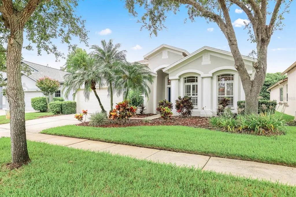 Welcome to this beautifully maintained Suarez-built home, perfectly positioned in the highly sought-after gated enclave of Martin Meadow within Fishhawk Ranch. Offering 4 bedrooms, 3 bathrooms, and a spacious 2 car garage, this residence seamlessly blends timeless design, thoughtful upgrades, and an ideal floor plan that is both functional and inviting. From the moment you step through the custom front door, you’ll be welcomed by a spacious formal living and dining room accented with warm wood floors, decorative columns, and plantation shutters. Perfect for entertaining or holiday gatherings. At the heart of the home, the gourmet kitchen stands out with 42” solid cherry cabinetry featuring soft-close drawers, gleaming granite countertops, a designer backsplash, and stainless steel appliances. A spacious walk-in pantry ensures ample storage, while the breakfast nook provides the perfect spot to enjoy morning coffee. Just off the kitchen, a well-appointed laundry room with cabinets, soaking sink, and a washer and dryer (included with the sale) adds everyday convenience. The kitchen opens directly to the large family room with vaulted ceilings, creating a natural flow for both casual living and entertaining. From here, sliding doors lead to your private outdoor oasis. The covered lanai extends to a stunning screened and pavered pool area, showcasing a heated pool with water fountains, stacked stone accent wall, bubbler, and a sparkling glass tile spillover spa—professionally completed in December 2022. This backyard retreat was designed for year-round enjoyment, from relaxing evenings to lively gatherings. The split-bedroom floor plan ensures privacy, with the primary suite serving as a true retreat. Recently updated with new carpet (August 2025), the suite features a spacious walk-in closet and a spa-like en-suite bathroom complete with a dual sink vanity, soaking tub, and a frameless glass walk-in shower. Bedrooms 2, 3, and 4 are located on the opposite side of the home, with Bedroom 2 also enjoying new carpet (August 2025) and Bedrooms 3 and 4 featuring engineered hardwood floors and a shared Jack & Jill bath. Ceiling fans throughout all bedrooms and the family room add comfort and efficiency. Recent updates add peace of mind, including a freshly repainted interior (2025), exterior paint (2020), new hot water heater (2024), HVAC replacement (2022), and the roof, which will be replaced prior to closing. Living in Fishhawk Ranch means enjoying resort-style amenities at your fingertips. Residents have access to multiple community pools, fitness centers, playgrounds, basketball, pickle ball, and tennis courts, clubhouses, and miles of scenic trails. The community is also home to top-rated schools and is conveniently located near shopping, dining, and commuter routes, making it one of Tampa Bay’s most desirable places to live.